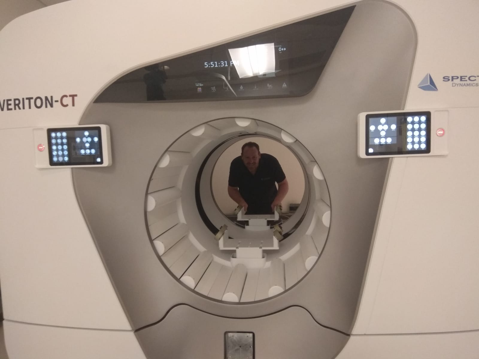 מדובר בסטראפ-אפ שכבר הונפק בשנת 2013, ממש באותו היום ש- waze הונפקה. לחברה קוראים Spectrum-Dynamics Medical (הנמצאת באזור התעשייה של קיסריה) והיא פיתחה דור חדש של מצלמות גרעיניות לעולם הרפואה. ברפואה המודרנית משתמשים בטכנולוגיית CT (רנטגן), טכנולוגיית MRI (מגנטיות) ואנחנו למעשה עובדים בתחום נוסף שנקרא הרפואה הגרעינית. כלומר, בכל אחד מהענפים האלה לא רואים את אותם ממצאים על גוף האדם. המכונה שלנו סורקת את מערכות הלב, הכליות, המוח ואת כל שאר האיברים הזזים. בעבור לקוחות המעוניינים בזה אנחנו משלבים את המערכת שלנו עם מערכת CT, כלומר האדם הנסרק שוכב על המיטה שעוברת בתוך המכונה ובסיום הסריקה המיטה ממשיכה עוד קדימה והנסרק ממשיך לסריקת CT.