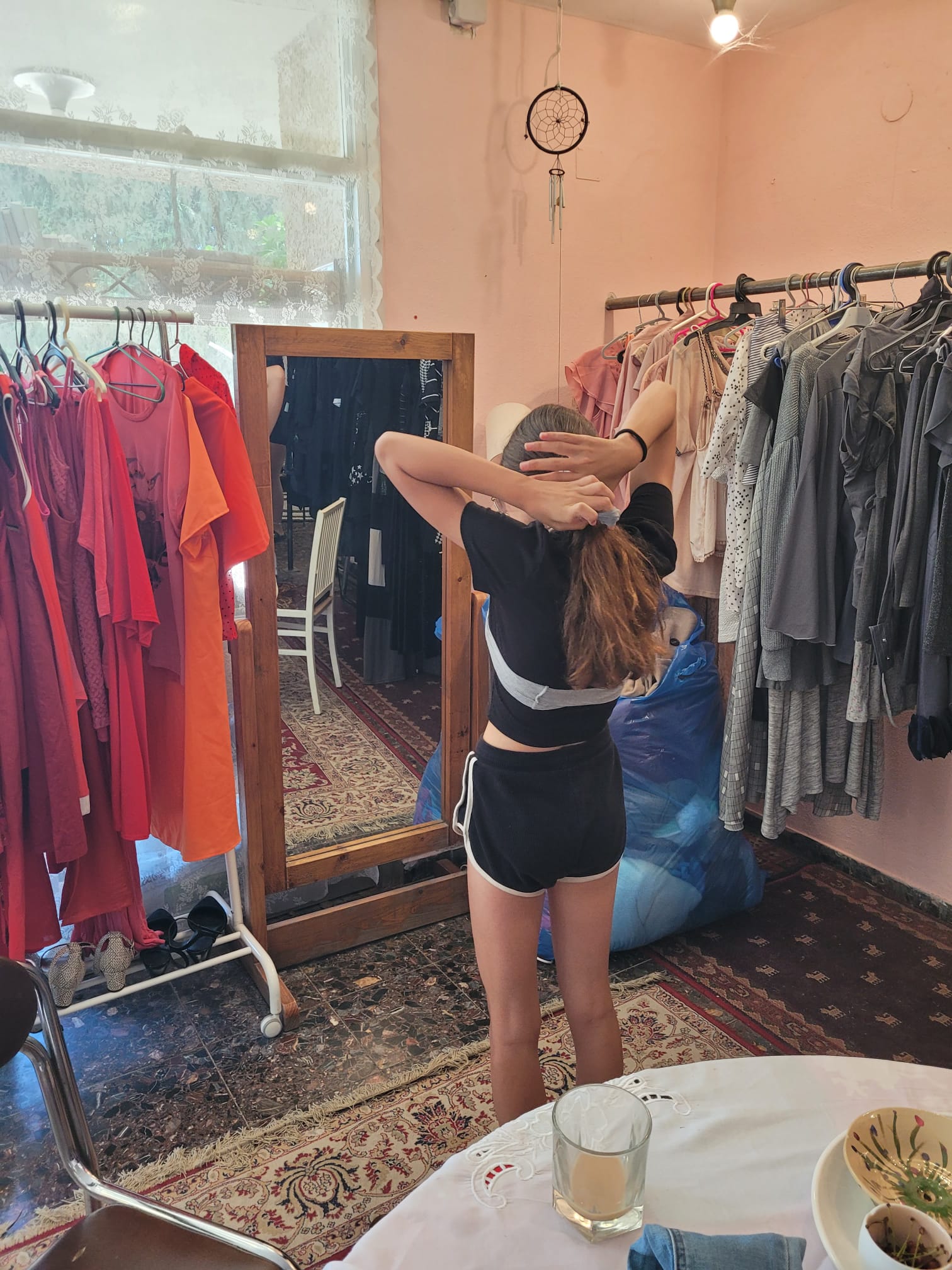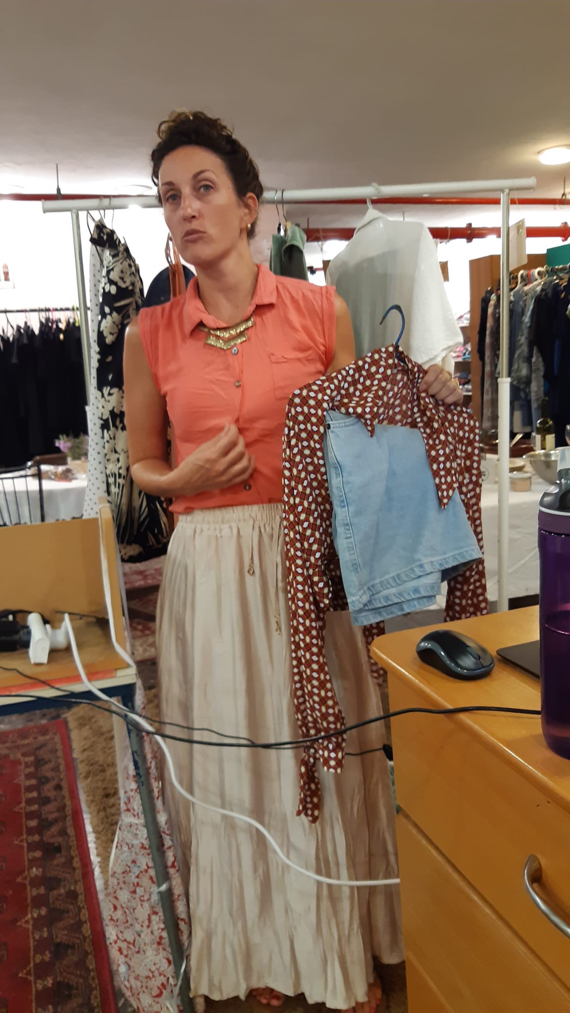 לאחר מכן, ישבנו לשמוע הרצאה של שירה בר אילן, שיחד עם עפרי אביב ואיתי, הקימה את המקום לפני למעלה משנתיים. שירה למדה הנדסת סביבה ועסקה בתחום לפרנסתה, אך מזה זמן שהיא מצילה את העולם בדרך מלאת סגנון ויחודיות, כשהיא מציעה מגוון שירותי סטיילינג בדגש על יד שנייה.