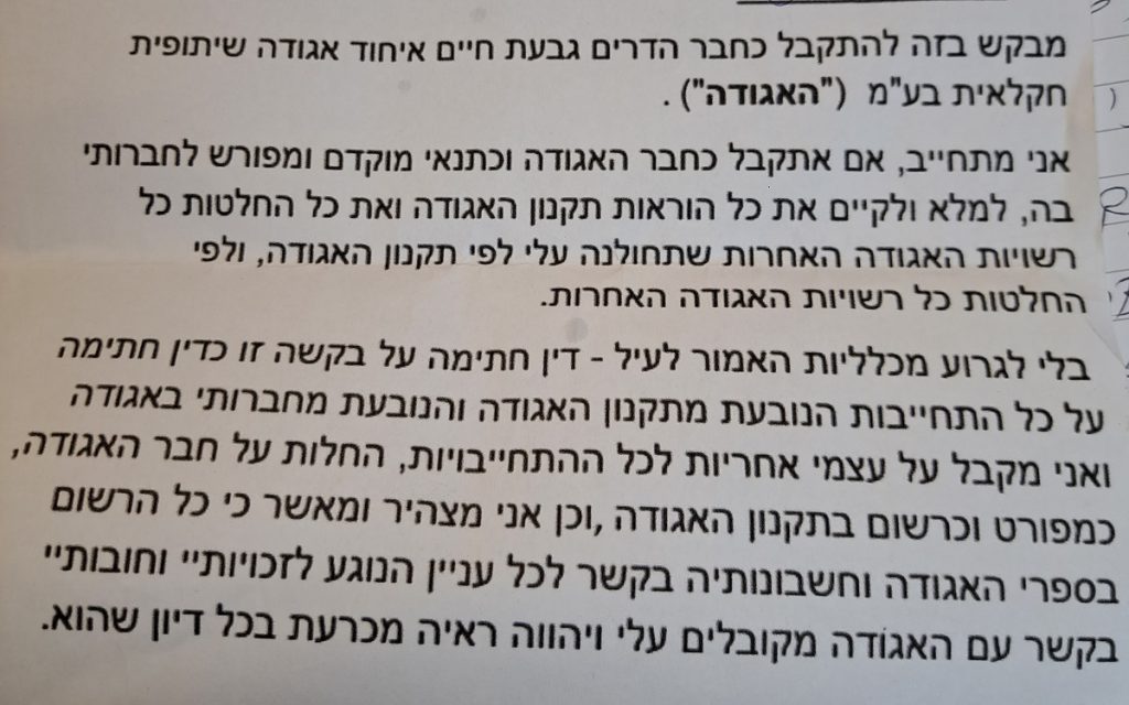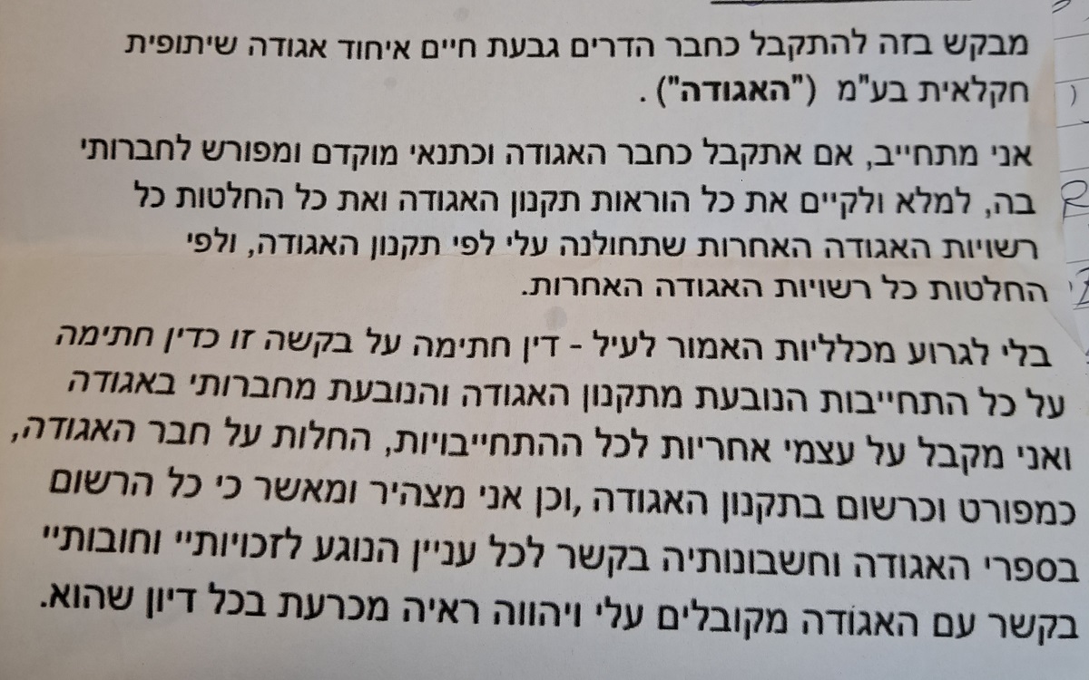 "אם קוראים בעיון את כל הסעיפים בתקנונים של 'מילואים' ושל 'הדרים', ניתן להבחין בשוני", אומרים דויד ודורון. "בעוד 'מילואים' היא קרן סיעודית סגורה עבור חברי קבוצת ה-400, גורס סעיף 10 בתקנון 'הדרים' כי כל חבר קיבוץ שקיבל נקודות הורשה בירושה אחרי שהוריו נפטרו, זכאי להצטרף כחבר לאגודה השיתופית 'הדרים'. ניתן להגיש בקשה (ראו צילום) ואין צורך בהצבעה על המועמד/ת אם עמד/ה בתנאים שצויינו כאן".