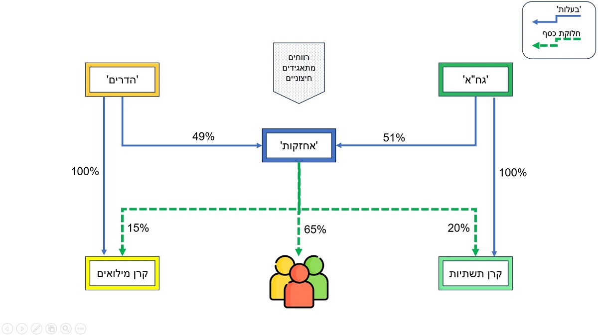 "כפי שניתן לראות באיור, יש ארבעה גופים בסיפור הזה של תאגיד האחזקות", הם פותחים. "גח"א, 'הדרים', קרן 'מילואים' וקרן תשתיות, כאשר לגח"א יש 51 אחוזים באחזקות בעוד שקבוצת 'הדרים' (קבוצת ה-400) מחזיקה 49 אחוזים".