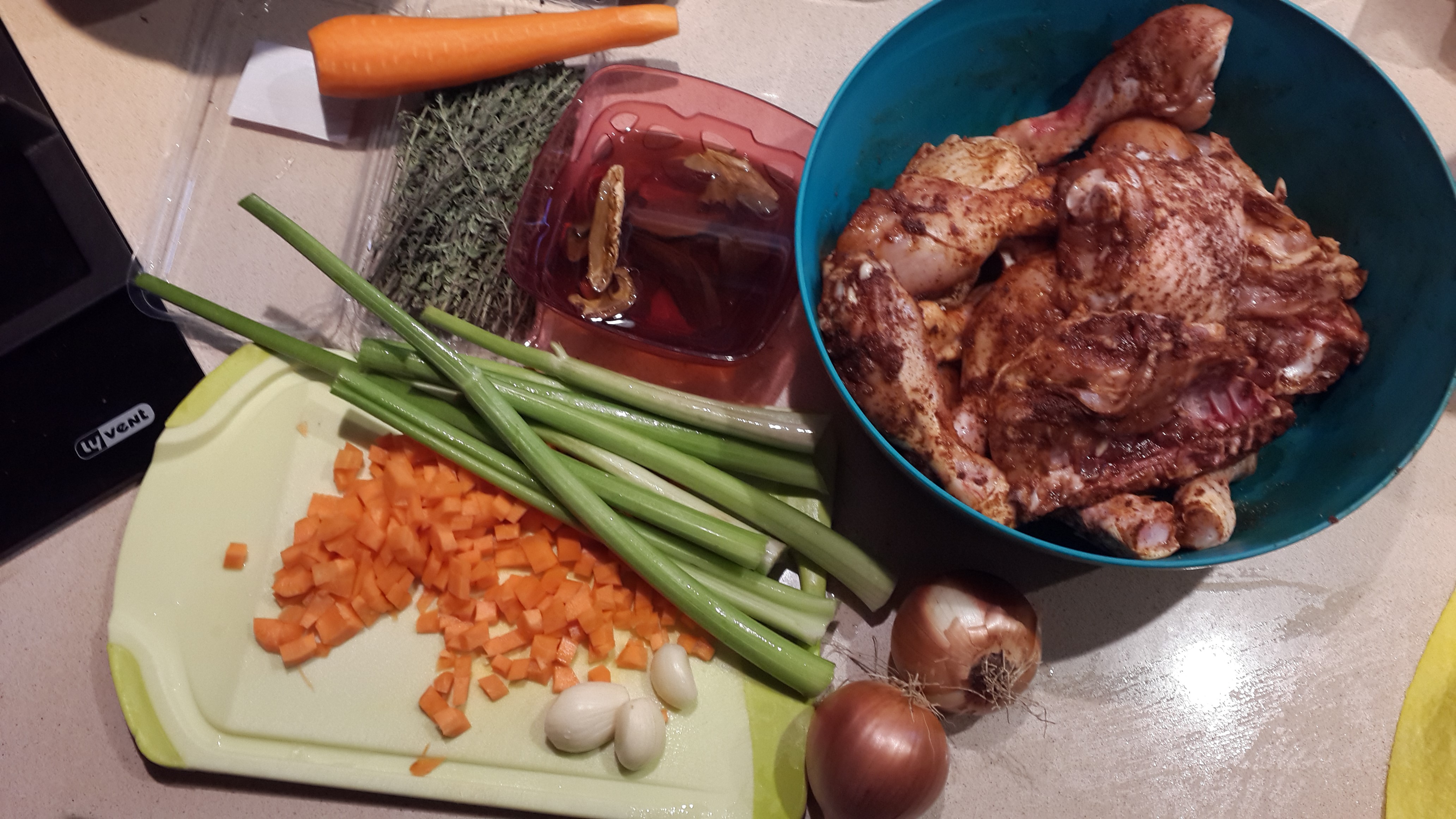 להוסיף יין, את מי ההשריה של הפטריות, עלי תימין, מלח, פלפל אם צריך, מעט מים לכיסוי העוף (עד 2/3 מגובה העוף).