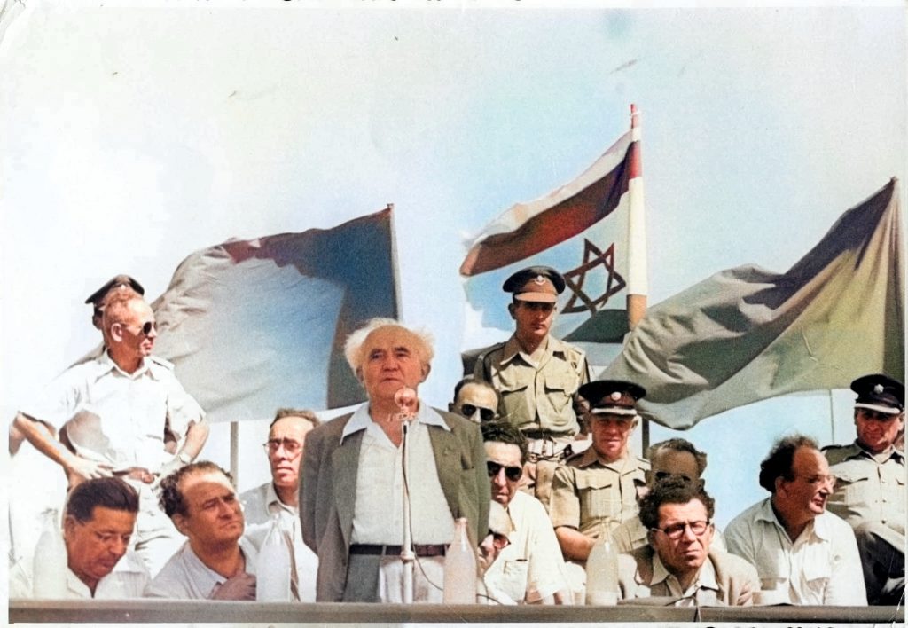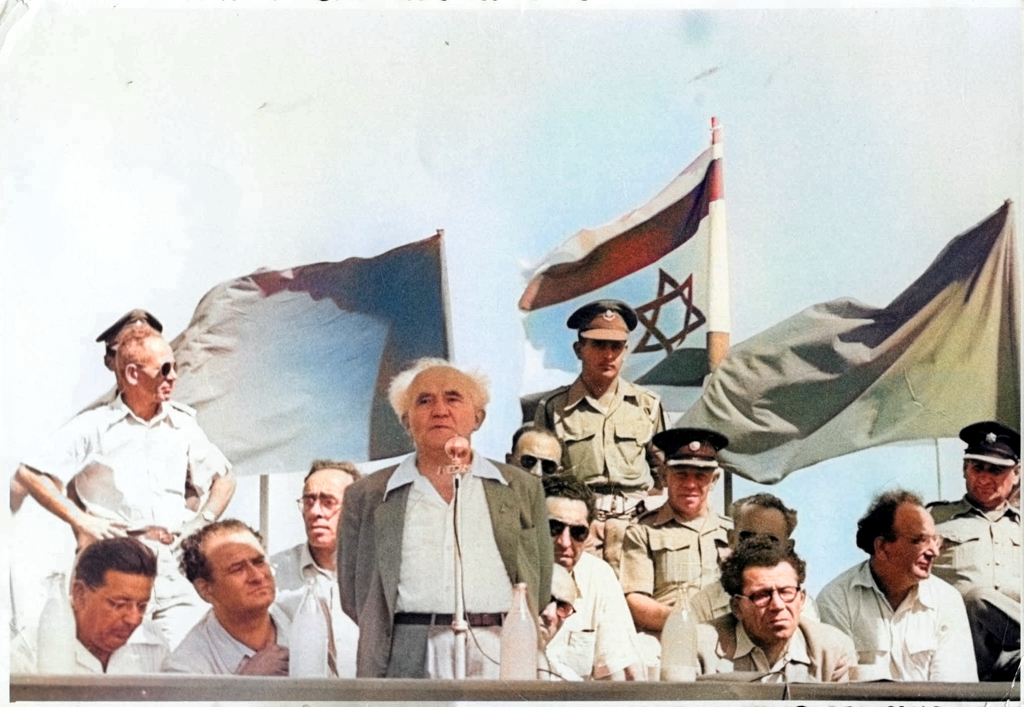 ואז הגיע ה' באייר תש"ח. היו אלה רגעים של מתיחות וחגיגיות כבושה, כאשר ישבנו צפופים ליד מקלט הרדיו והאזנו בנשימה עצורה לקולות הבוקעים ומבשרים כי קמה מדינת ישראל. לפתע, מבעד לקולות, עלתה לפנינו דמותו של האיש אשר היה זה יומו הגדול. ראינו לנגד עינינו את "האיש הקשה", איש "הריב והמדון" – איש המלחמה והחזון.