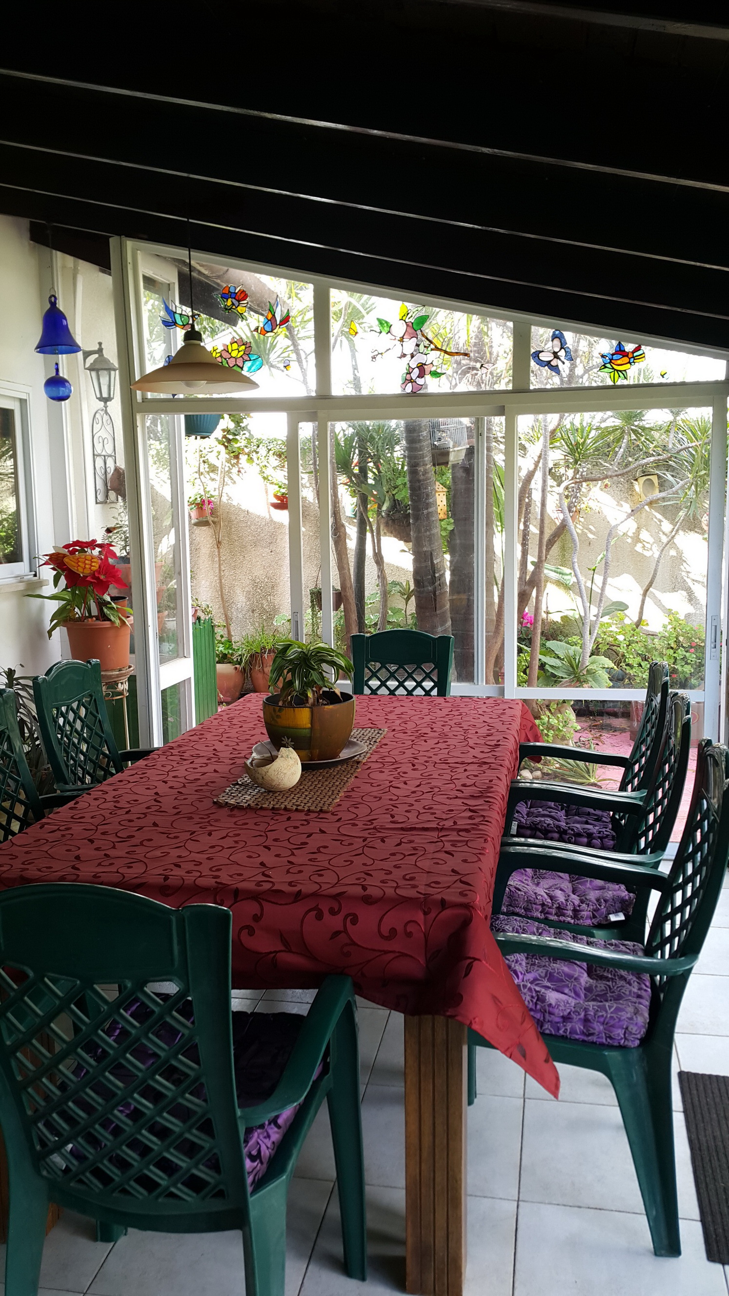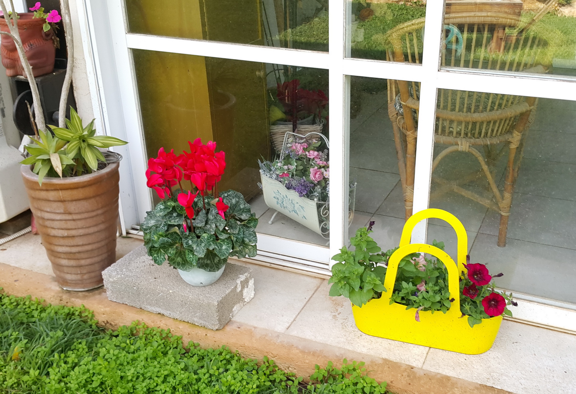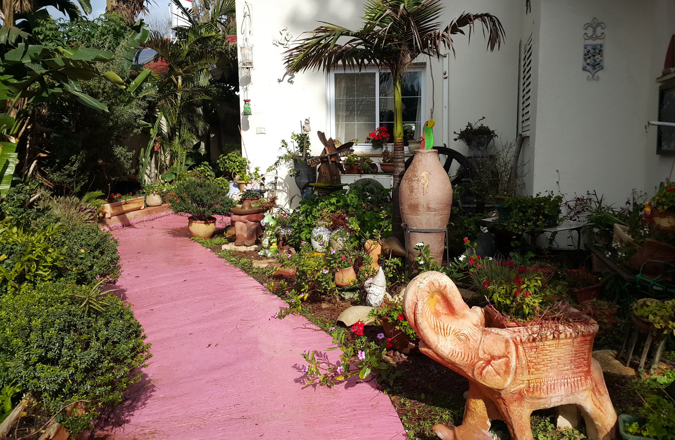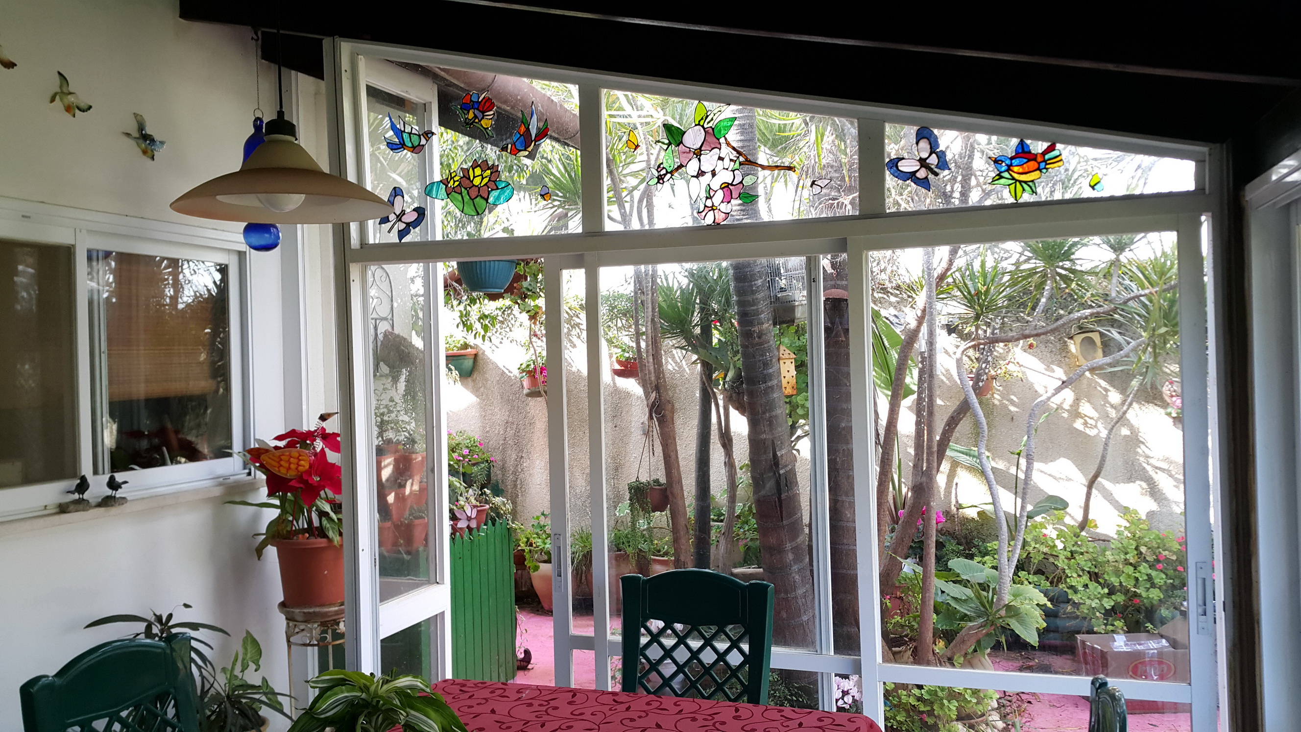רבקל'ה סגרה את המרפסת בחלונות זכוכית, דרכן משתקף הגן המטופח והירוק אל עבר עגלות פרחים שבנה אריה. במרפסת שולחן אירוח גדול (רבקל'ה היא מארחת נהדרת).