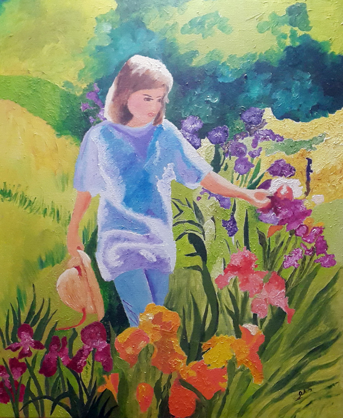 אחת מהתמונות היפות שצייר אריה – הרבה צבע שמתחבר לפרחים שרבקה אוהבת.
