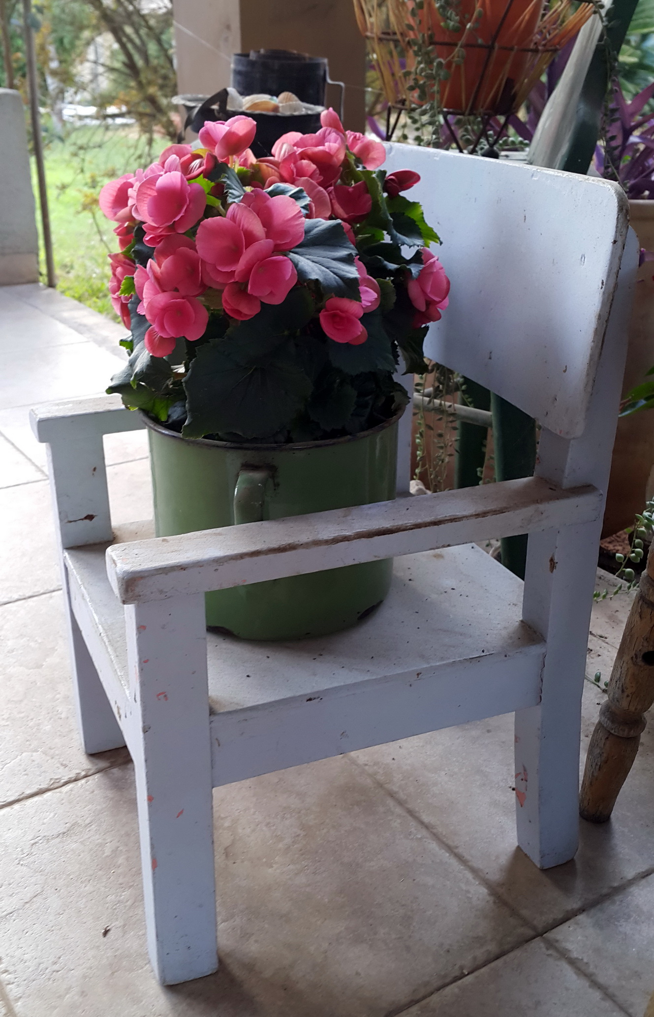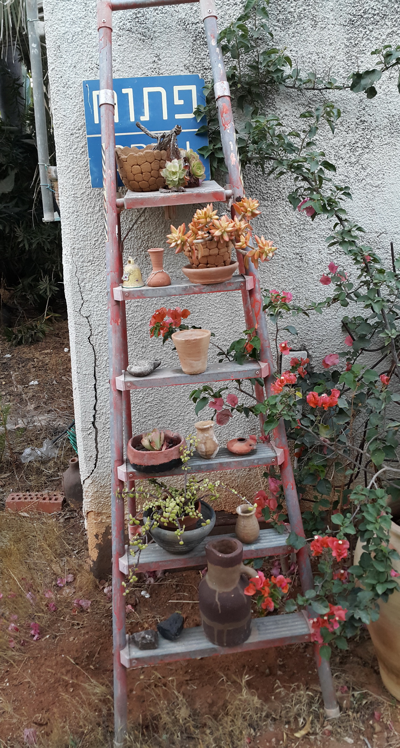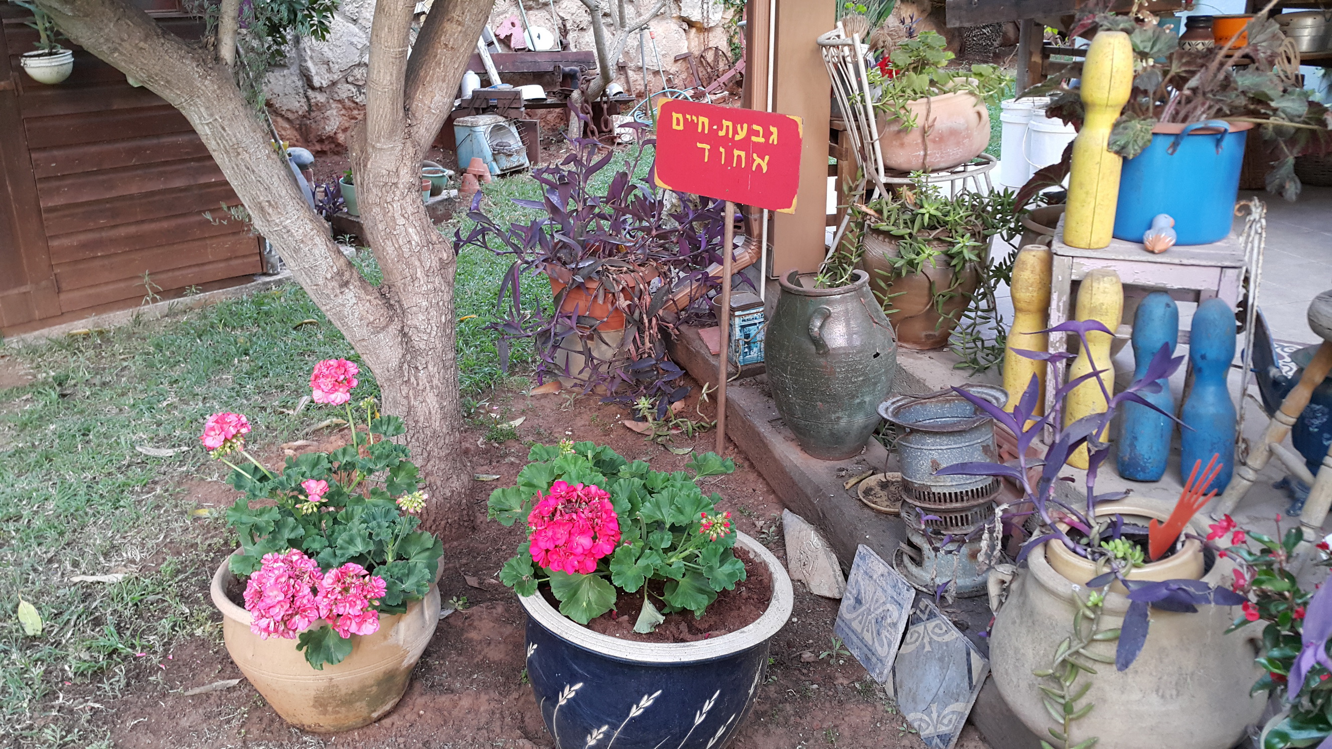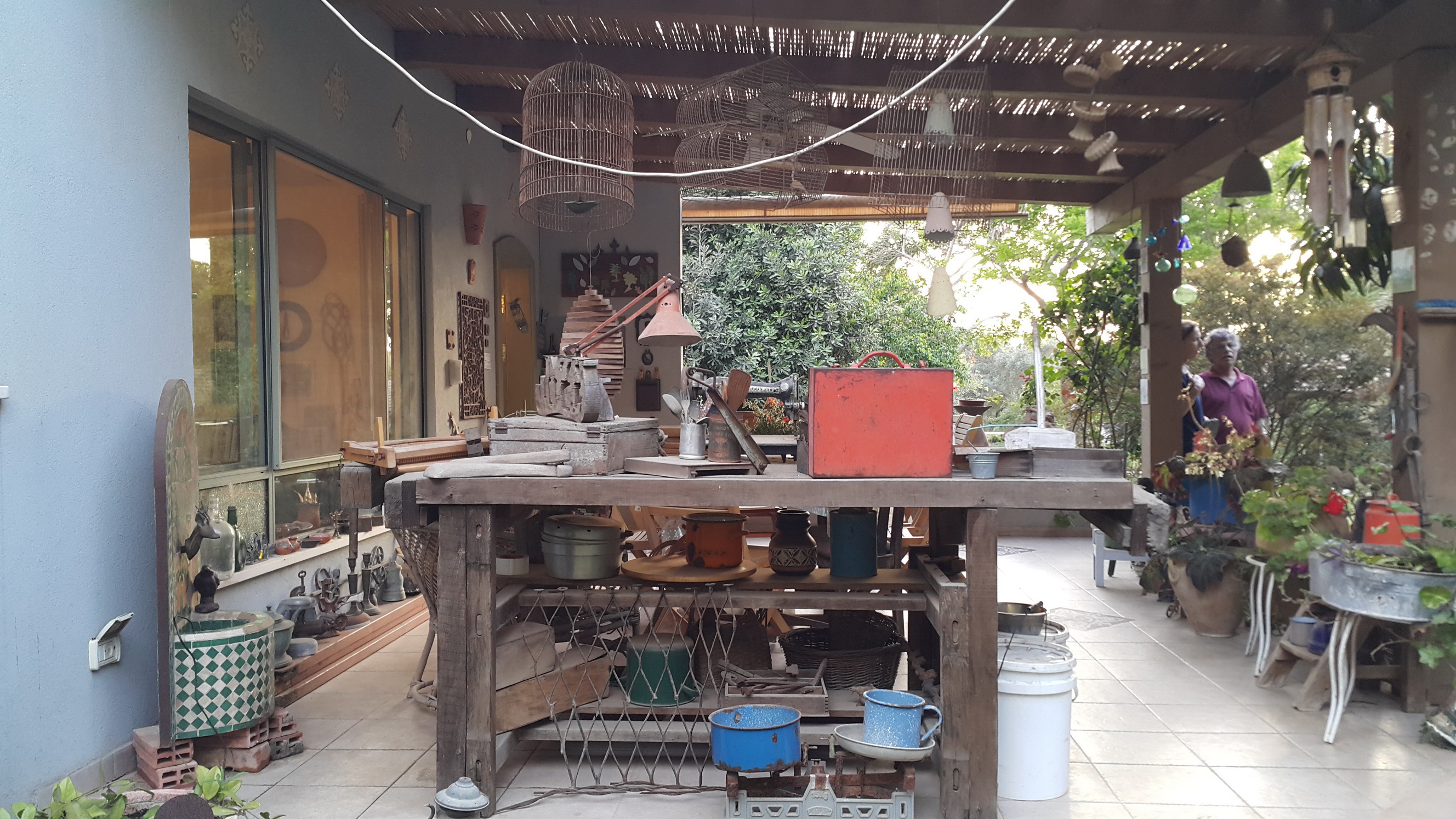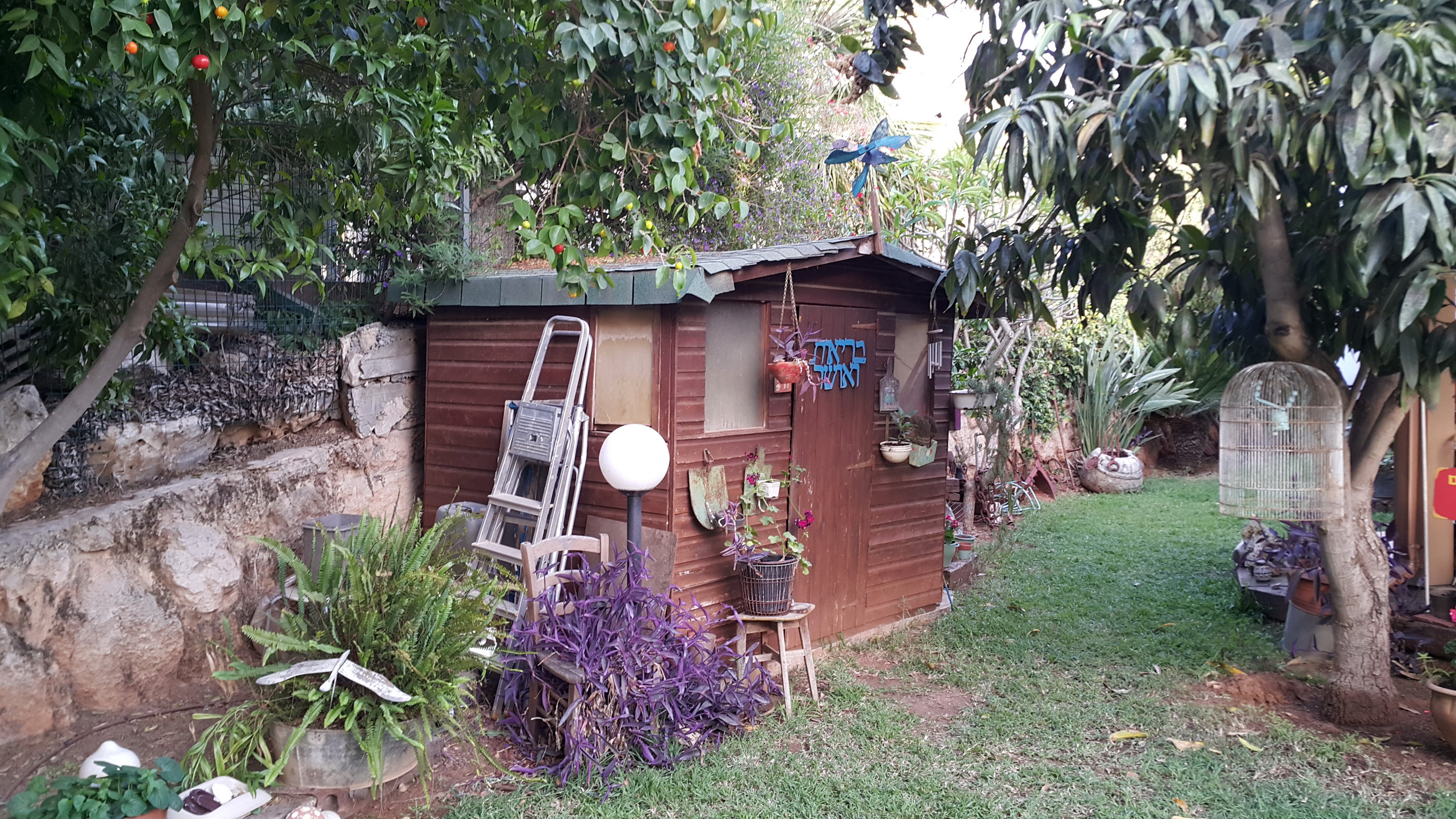 החצר היא הממלכה של אלי – מטופלת ויפה, וגם בה "שתולים" לצד עצי פרי ופרחי נוי פסלונים, חפצים מפעם, ואביזרים שהביאו מטיולים בעולם (ככה זה שחיים עם מדריך טיולים).