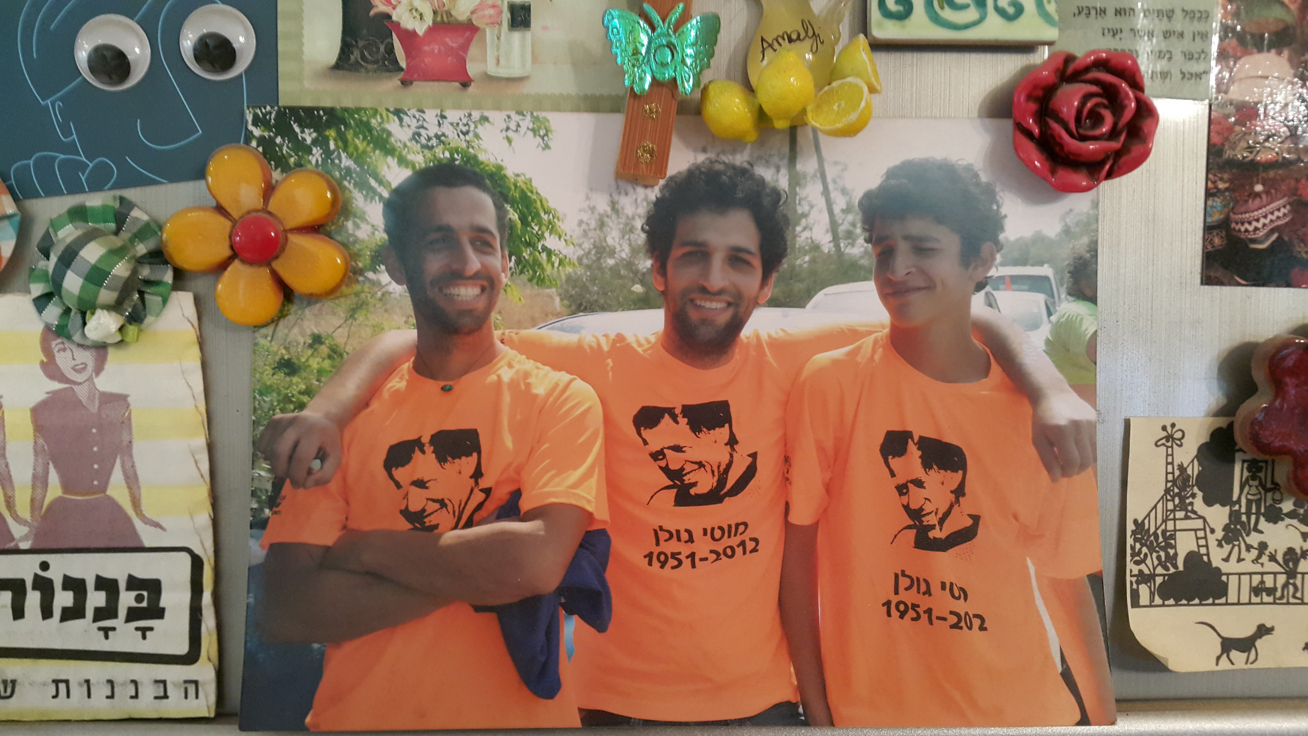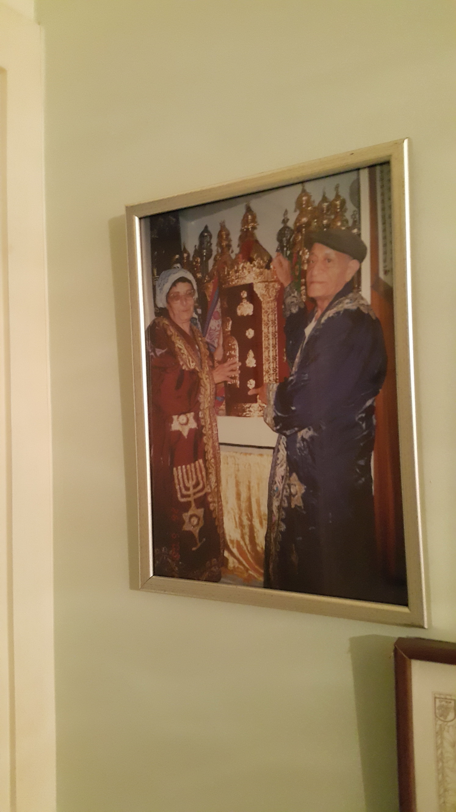 למעלה ההורים של אלי אוחזים בספר תורה שתרמו לבית כנסת. מתחתם פינדה וחווה, חלק מקיר שלם של תמונות ישנות של המשפחה, שערה רצתה שיהיו איתה.