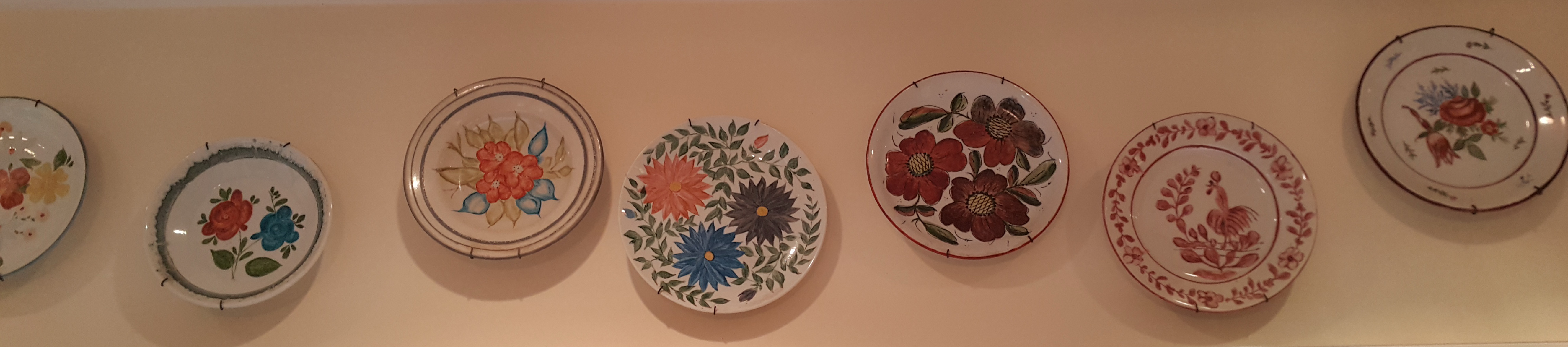 במטבח תלויות צלחות מצויירות פרי יצירתו של פינדה כמו עוד עבודות שפינדה עיטר ותלויות ברחבי הבית (משמאל ולמטה).
