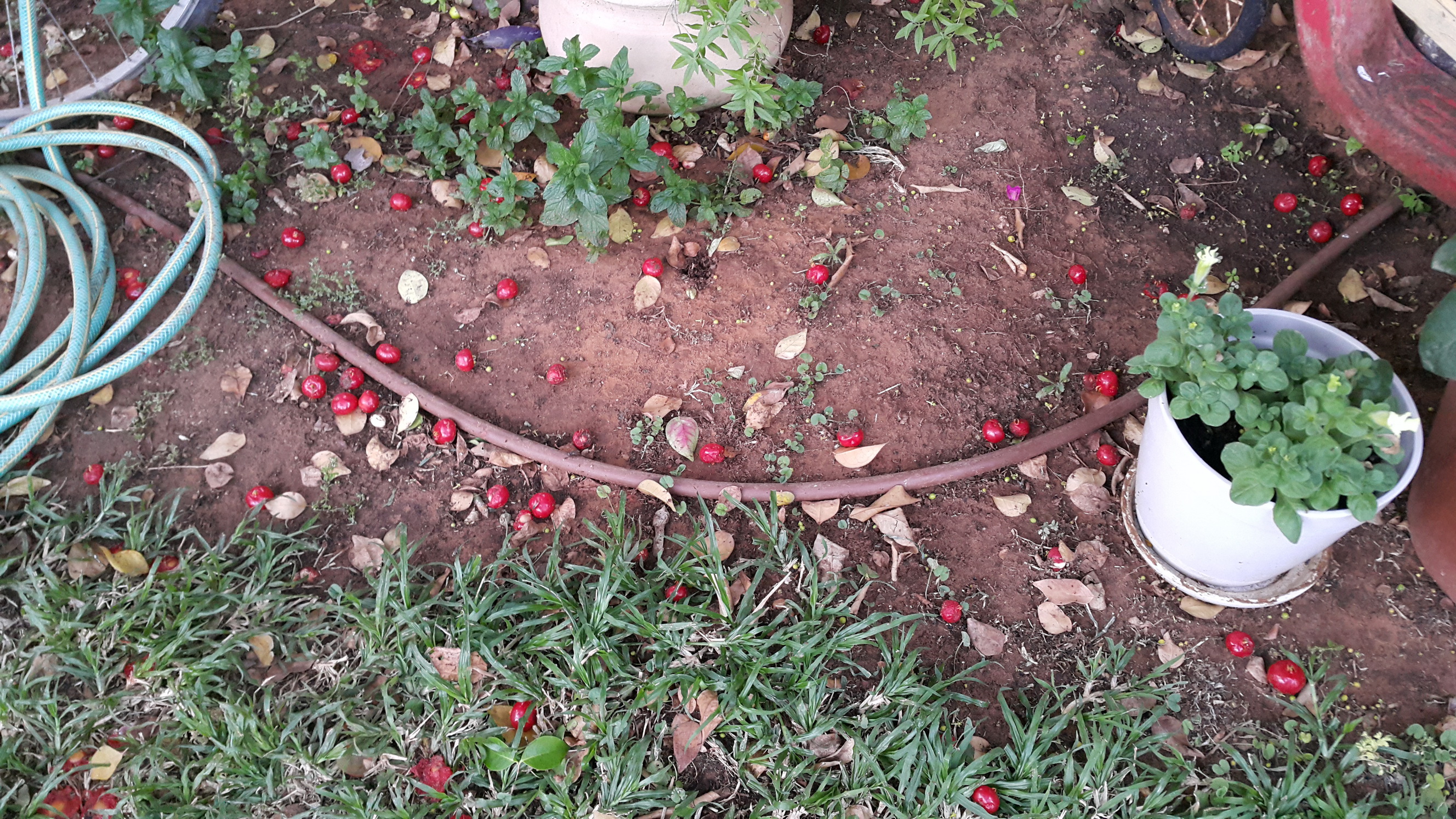 בחצר עץ הפיטנגו משיל מעליו פירות אדומים עסיסיים ומי ששפר גורלו יקבל גם אצל ערה ואלי תותים נהדרים שהם קטפו בנחל אלכסנדר.