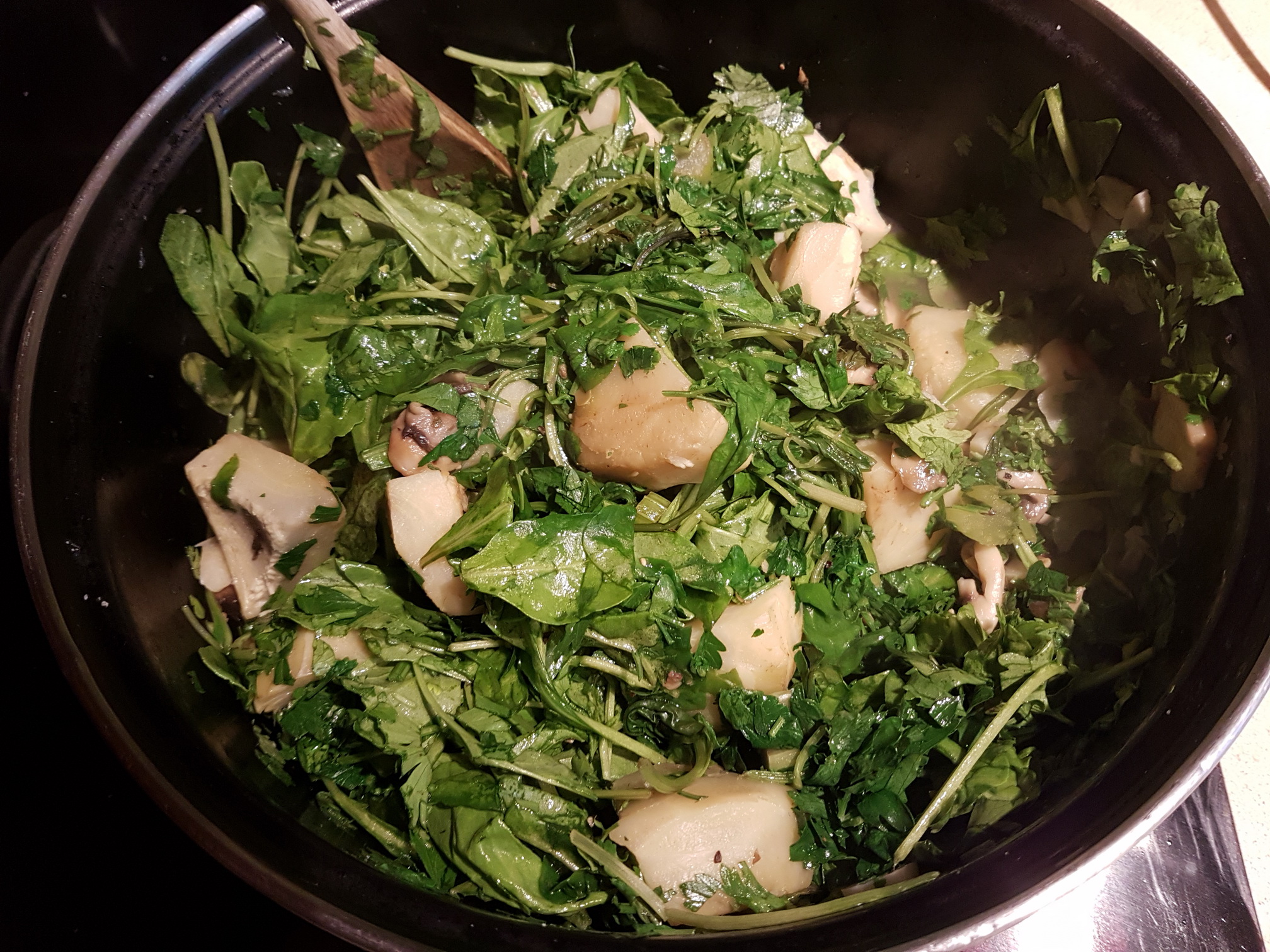 מוסיפים את עלי התרד, מתבלים בלימון ותבלינים ומערבבים היטב. לא לתת לתרד לאבד מנפחו ולהפוך להיות מסמורטט מדי.